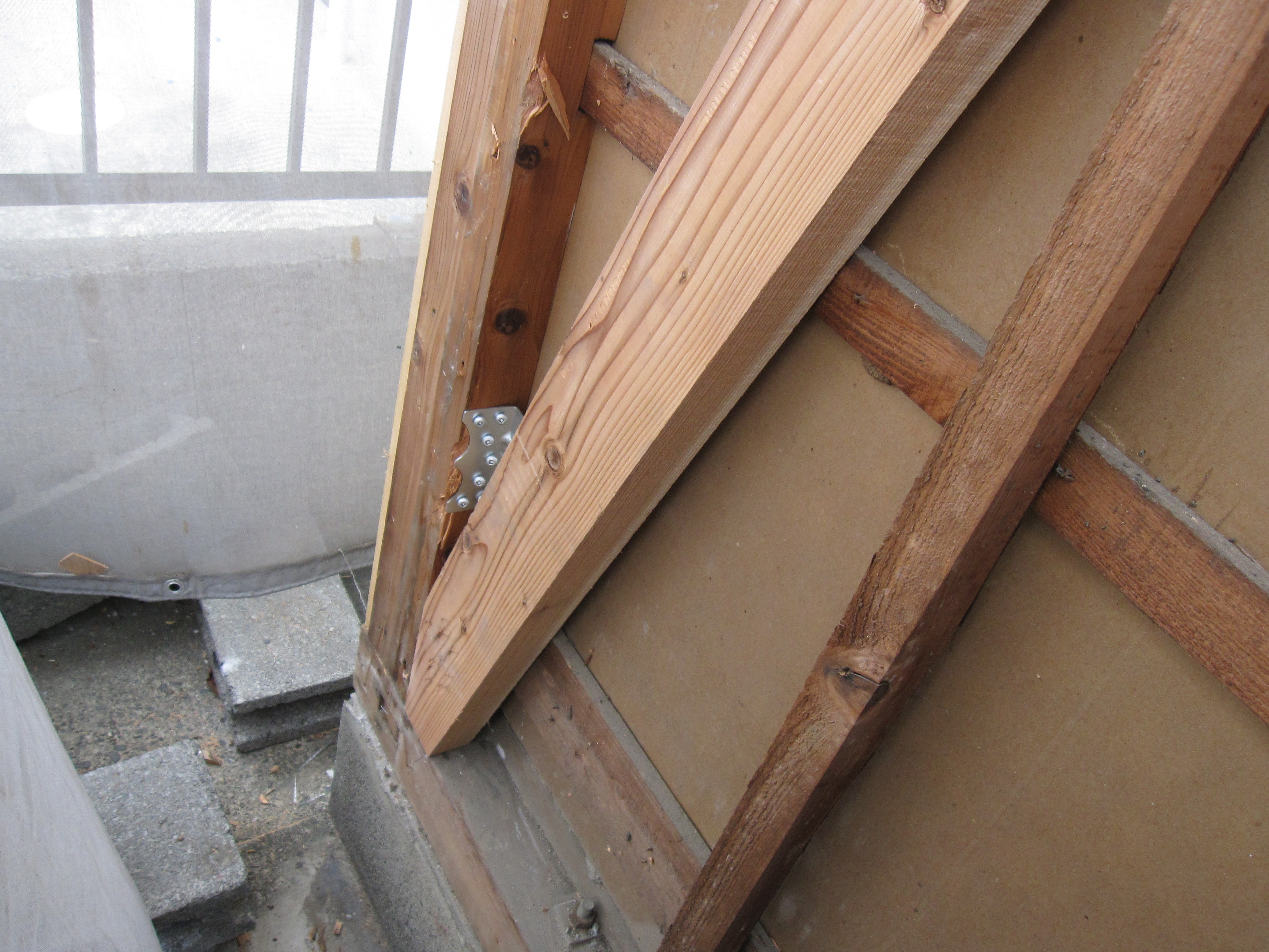 リフォーム工事:筋交いを入れて、金物を取り付けます。 又、柱の柱脚・柱頭にそれぞれ、金物を取り付けます。 金物の大きさも計算によって変わってきます。 写真の場所は15kNの金物になります。