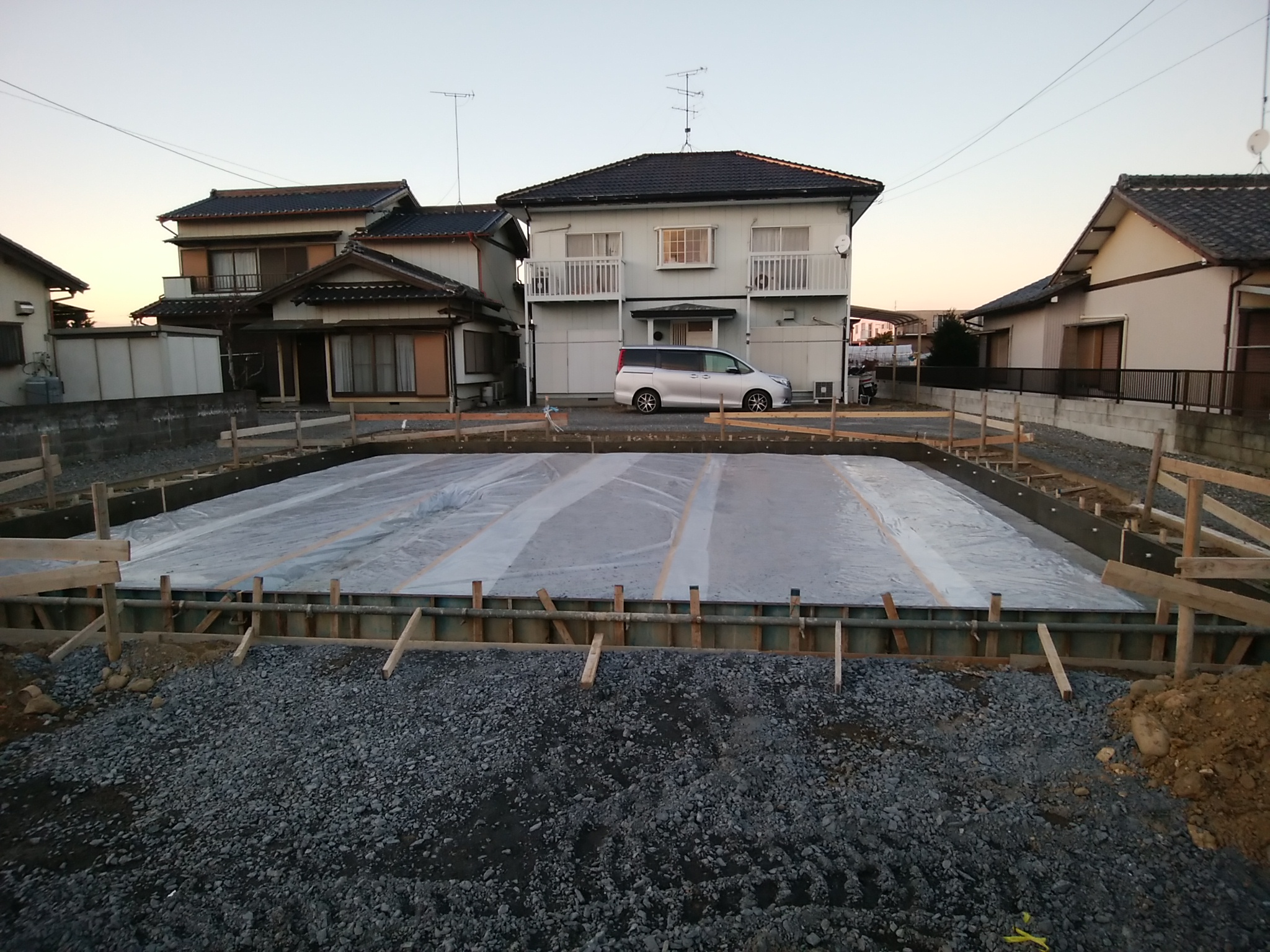基礎砕石状況です。 砕石の上に防湿シートを張り、これから鉄筋工事です。