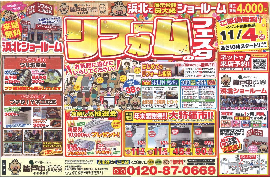 リフォームフェスタ開催!!!日頃の感謝の気持ちを込めまして、リフォームフェスタを開催いたします!=============================【開催日】2019年11月4日(祝・月)【時間】10:00~16:00【場所】浜松市浜北区本沢合814 浜北ショール...